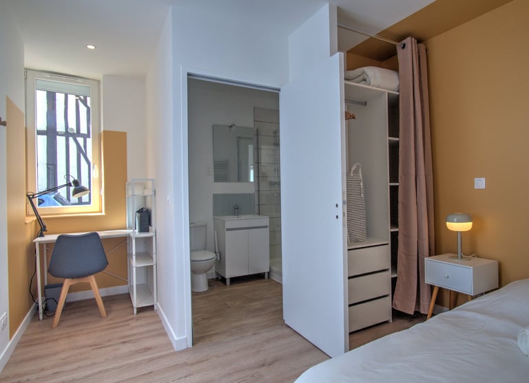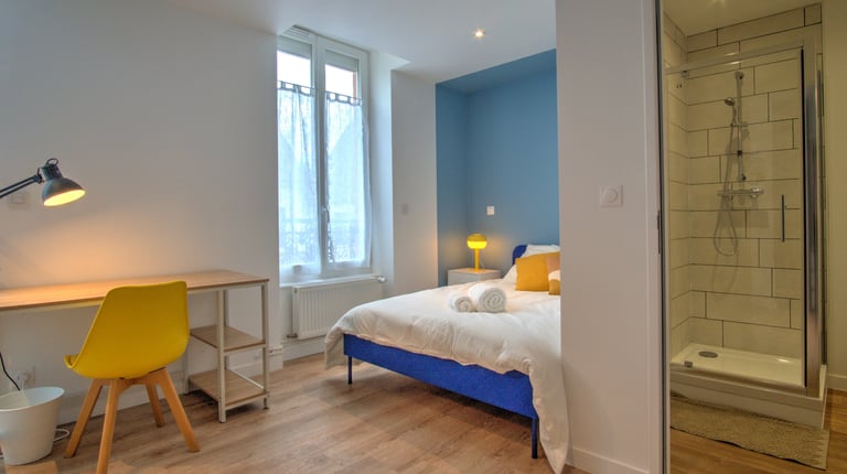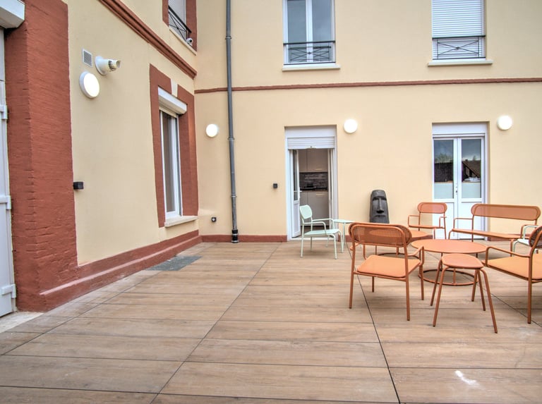 Cette maison de maître, située en plein centre ville, était depuis des années utilisée en bureaux. L'investisseur a souhaité la réhabiliter complètement en résidence de coliving : chambres meublées avec SDB privative et pièces communes (salon, séjour, double cuisine, buanderie, cellier, cave, terrasse, local vélo...